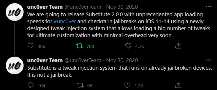nowadays unc0ver team on the Substitute project, they have released the latest version of substitute 2.0.0 for iOS 11 – iOS 14 using a newly designed tweak injection system.